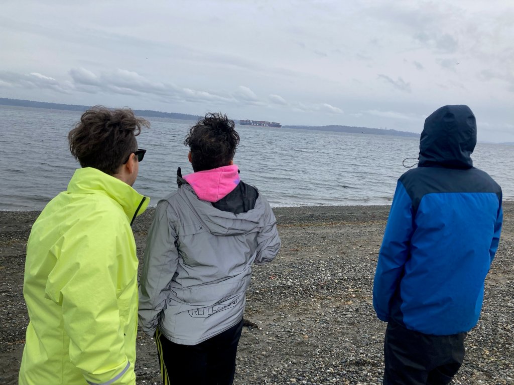 Once the tents were set up, we decided to explore the beach near the campsite. Although it was rainy and gloomy, looking towards Seattle made me happy. I was simply amazed by the beauty that surrounds the Puget Sound.