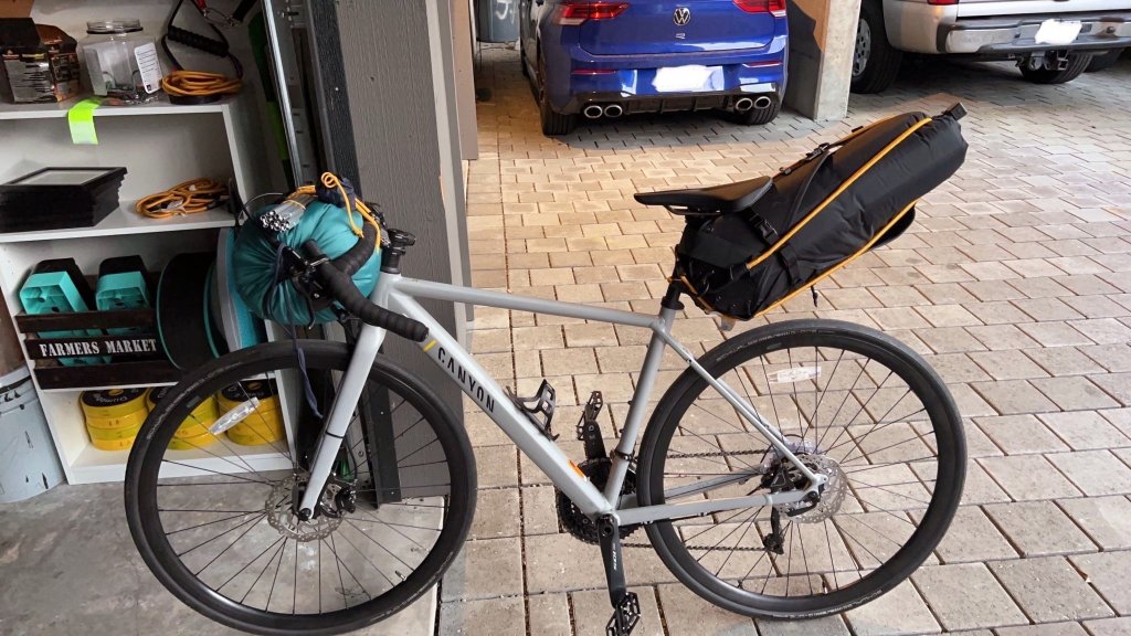 I own a Canyon Roadlite 6 bike, which features an aluminum frame. Aluminum frames have both advantages and disadvantages. One advantage is that you can securely attach items to the bike with a bungee cord without fear of damaging the frame. The main disadvantage is weight; aluminum bikes are heavier than other materials. However, since speed is not a major concern in bikepacking, aluminum frames are a better choice than carbon frames. Here is how my bike looked with all the gear attached.